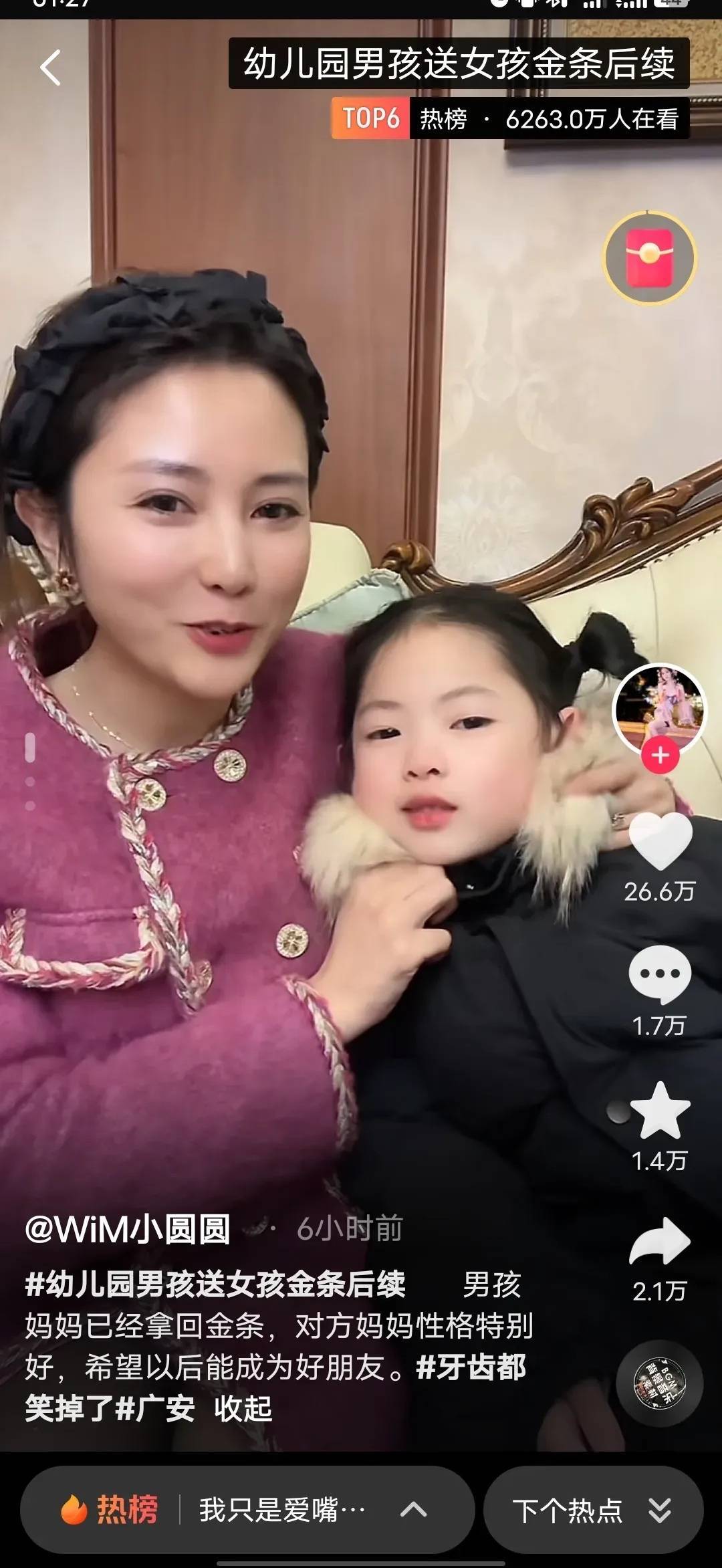 这段30秒的母女对话视频,记录着朵朵奶声奶气追问“说话算数不”,吴女士边切菜边笑着点头:“绝对算数,赞越多钱越多!”谁能料到,这条充满生活气息的短视频当晚就“炸”了。第二天一早,吴女士被手机提示音惊醒,点开一看——点赞数已经突破10万,到中午直接飙升到88万,截至1月21日更是冲到123万,评论区里全是网友的“助攻”:“必须让妈妈体验一下什么叫‘互联网的力量’”“这届网友是懂怎么让家长‘破防’的”。面对屏幕上不断跳动的数字,吴女士坦言自己从“淡定”到“震惊”再到“有点懵”。“感觉像做梦一样,”她在采访里哭笑不得地说,“早知道当初就该说一个赞一分钱了。”但玩笑归玩笑,这位普通妈妈做出了让全网点赞的决定:“说出去的话泼出去的水,肯定要兑现。”她已经先给女儿转了500元“首付”,还计划开设专门账户分期还款,甚至半认真地说“实在不行就把房子抵给女儿”。